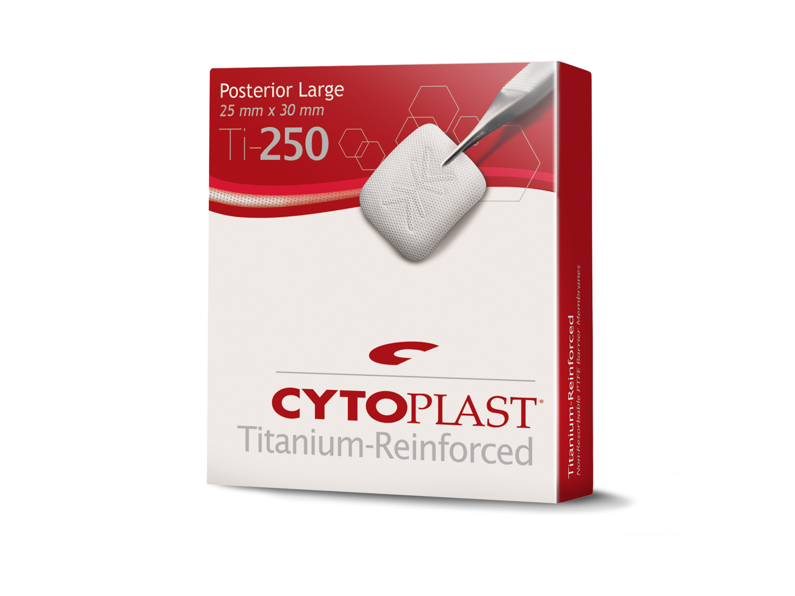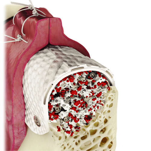 - Die breite Titan-Verstärkung steigert die Festigkeit der Membran, die dadurch raumschaffend und -erhaltend für Augmentationen wird.