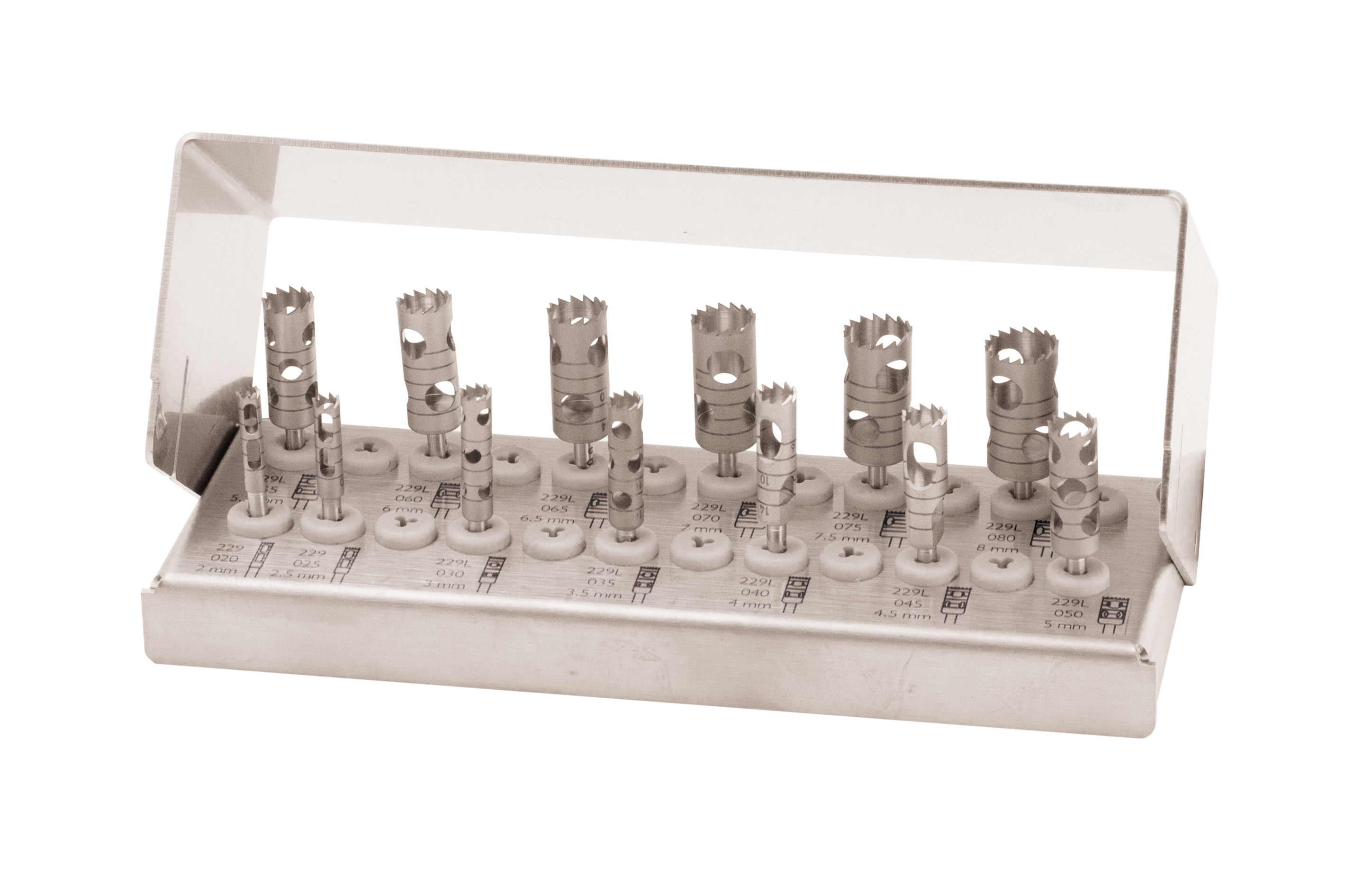 Das Trephine Kit Long bietet ein breites Sortiment hochwertiger Trepane in feinen Größenabstufungen. Diese sind zum präzisen und einfachen Erstellen von zylindrischen Knochentransplantaten sowie zur Knochen-entnahme geeignet. Die Trepane haben eine Tiefe von 14 mm* und eignen sich speziell für den Einsatz in der Kieferchirurgie und Implantologie. Dank der gut erkennbaren Tiefenmarkierungen im Abstand von jeweils 2 mm kann die Frästiefe wäh- rend der Behandlung jederzeit leicht und sicher abgelesen werden.