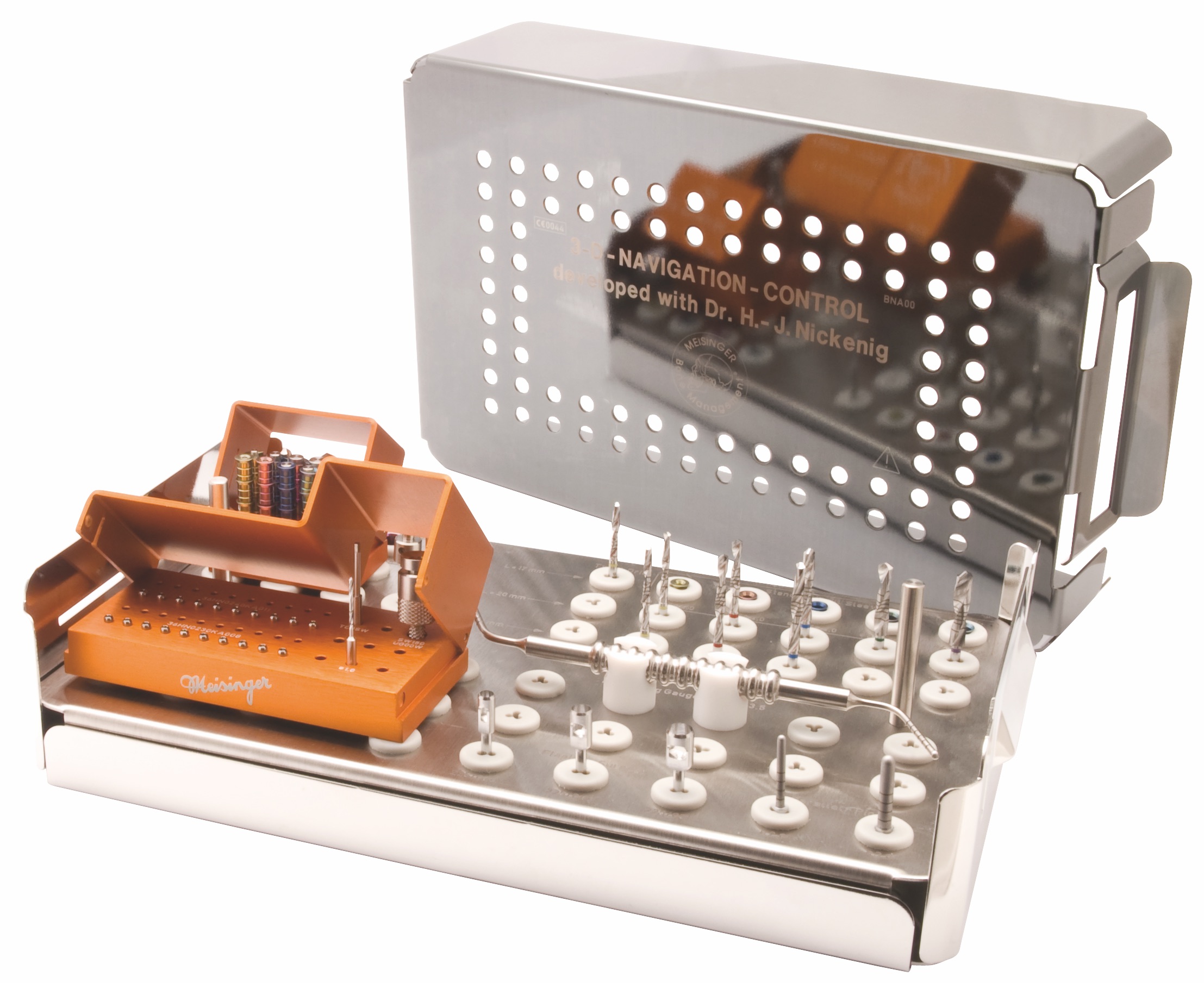 3D-Navigation-Control Professional ist ein Führungshülsensystem, welches für alle gängigen Implantatsysteme und Planungsprogramme geeignet ist. Dank der enthaltenen geschlossenen Standardhülsen und der offenen Führungshülsen für den Molarenbereich, erlaubt das Sortiment den Einsatz von Führungsschablonen sowohl im Frontzahnbereich als auch in eingeengter Molarensituation. Das System erfüllt darüber hinaus spezielle instrumentelle Erfordernisse einer Flapless Surgery. Das 3D-Navigation-Control Professional System enthält ein separates 3D-Laboratory-Kit, das dem Zahntechniker die exakte Hülseninstallation in der Schablone ermöglicht.