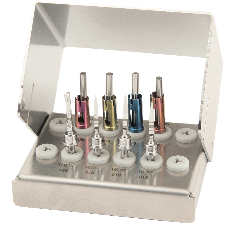 Das Implant Preparation Kit with Stop dient der einfachen und sicheren Aufbereitung des Implantatlagers. Die Stopphülsen erlauben einen definierten Tiefenstopp sowohl während des Vorkörnens, als auch während der Pilotbohrung. Für die Anwendung ohne Stopphülsen sind die Instrumente mit Lasermarkierungen ausgestattet.